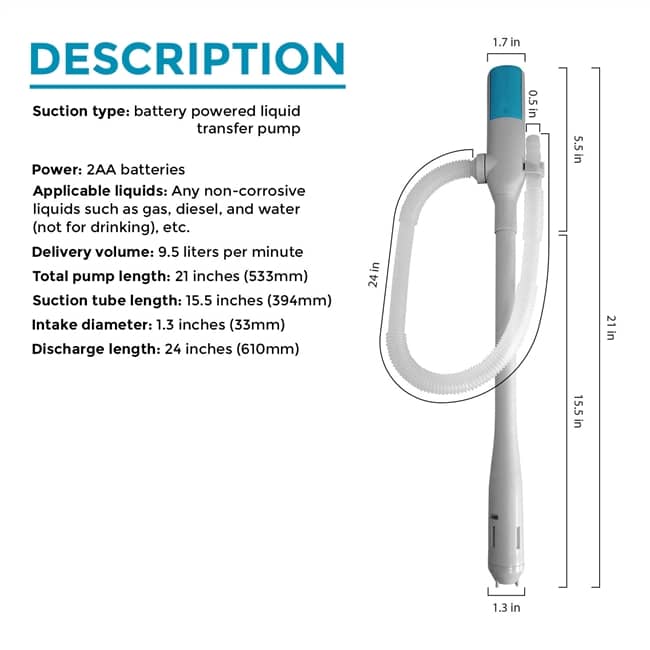 • Compatible Liquids: Gasoline, E15, E85 (Remove pump after use, E85 may corrode seals), diesel, kerosene, light oil, & non-potable water