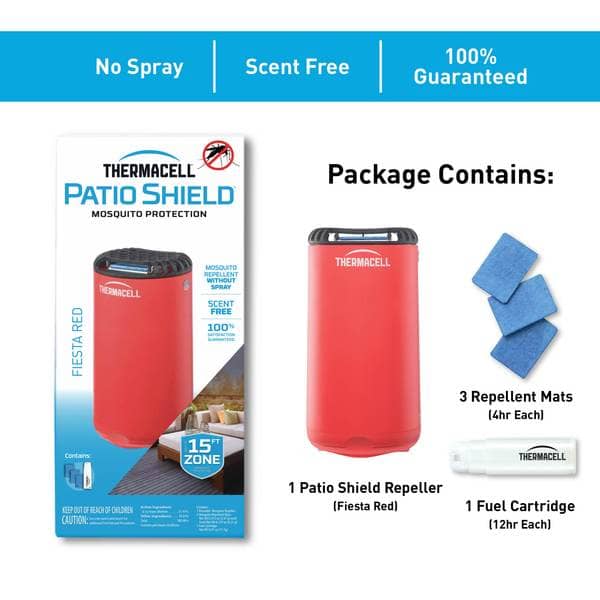 FIESTA RED PATIO SHIELD MOSQUITO REPELLER Patio Shield creates a 15-foot zone of protection against mosquitoes....