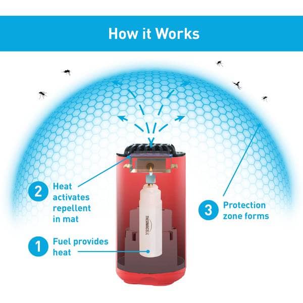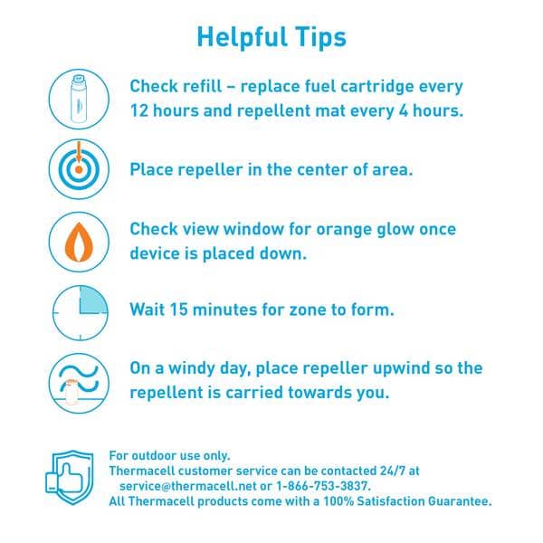 • Includes: One repeller, one 12-hour fuel cartridge, and three 4-hour repellent mats.