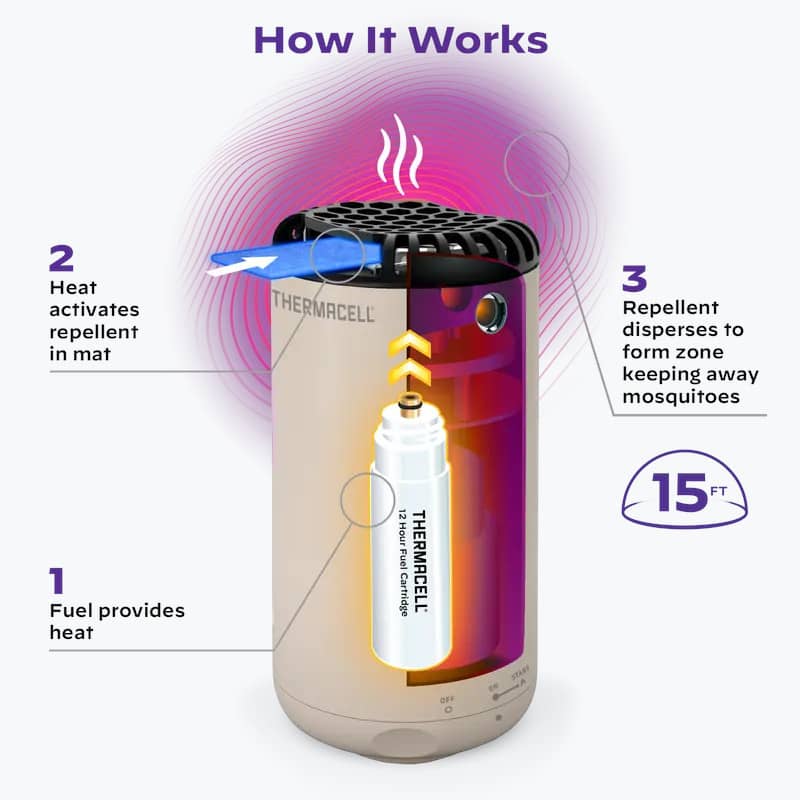 • Includes: One repeller, one 12-hour fuel cartridge, and three 4-hour repellent mats.